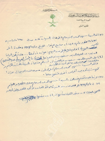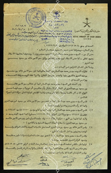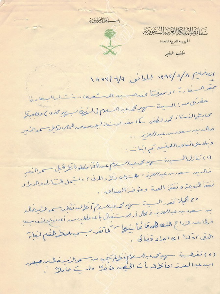 مغلف يدوي من الأمير خالد بن سعود بن عبد العزيز إلى السفير السعودي بالقاهرة في قضية طلاقه من الممثلة سهير رمزي