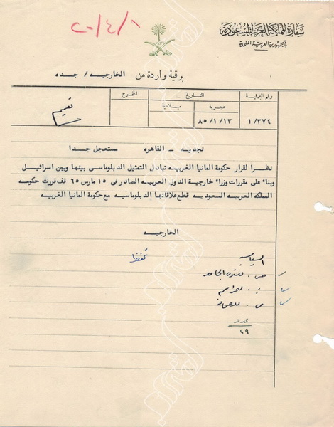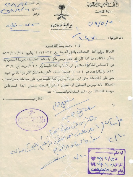 برقية من وزارة الخارجية إلى السفارة السعودية بالقاهرة
