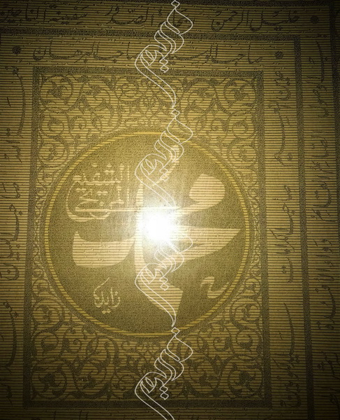 فن الخط العربي مخطوطة طبعة محدودة. اللوحة الرابعة. القاهرة نصوص من القرآن الكريم تشكل عن بُعد مناظر ومخططات من خلال مدود بين الأحرف وتفتيح أو تغميق الكتابة. المنظر: "محمد رسول الله ـ أسماؤه ـ آيات عنه من القرآن الكريم" النص: بقية الجزء التاسع والجزء العاشر والحادي عشر وبداية الجزء الثاني عشر من القرآن الكريم . إطار خشبي مذهب من مقتنيات الوالدة أم الخير أحمد قطب رحمها الله