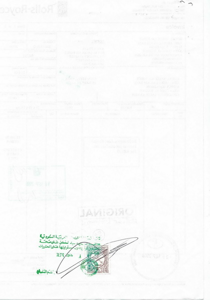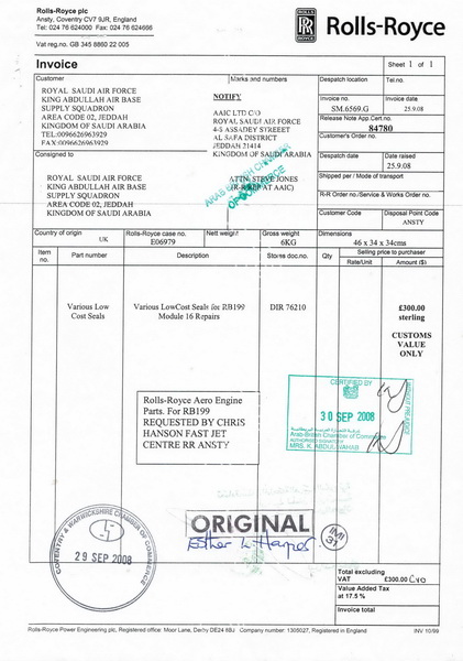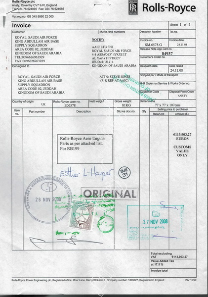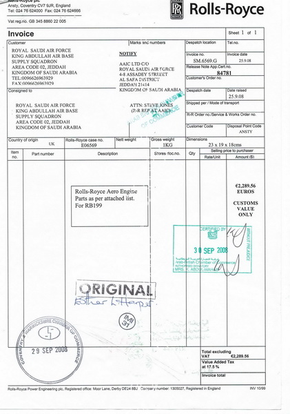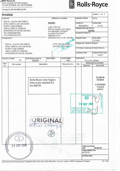 وثيقة فاتورة مبدئية لقطع غيار للسلاح الجوي