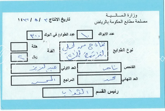 G1A-051 b بطاقة تسليم طوابع من وزارة المالية مصلحة مطابع الحكومة